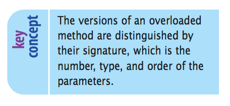 A method’s name along with the number, type, and order of its parameters is called the method’s signature. The compiler uses the complete method signature to bind a method invocation to the appropriate definition.